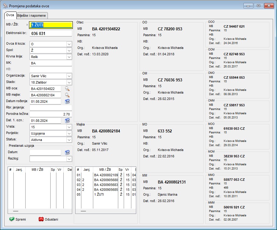 Program 'Ovce i koze' razvijen je kao sveobuhvatno rješenje za profesionalne uzgajivače ovaca i koza. U srcu programa nalazi se detaljna evidencija koja prati svaku životinju od rođenja kroz cijeli životni ciklus, bilježeći sve ključne podatke - od matičnog broja i elektronske oznake, preko pripadnosti stadu, do kompleksnih podataka o rodovniku.